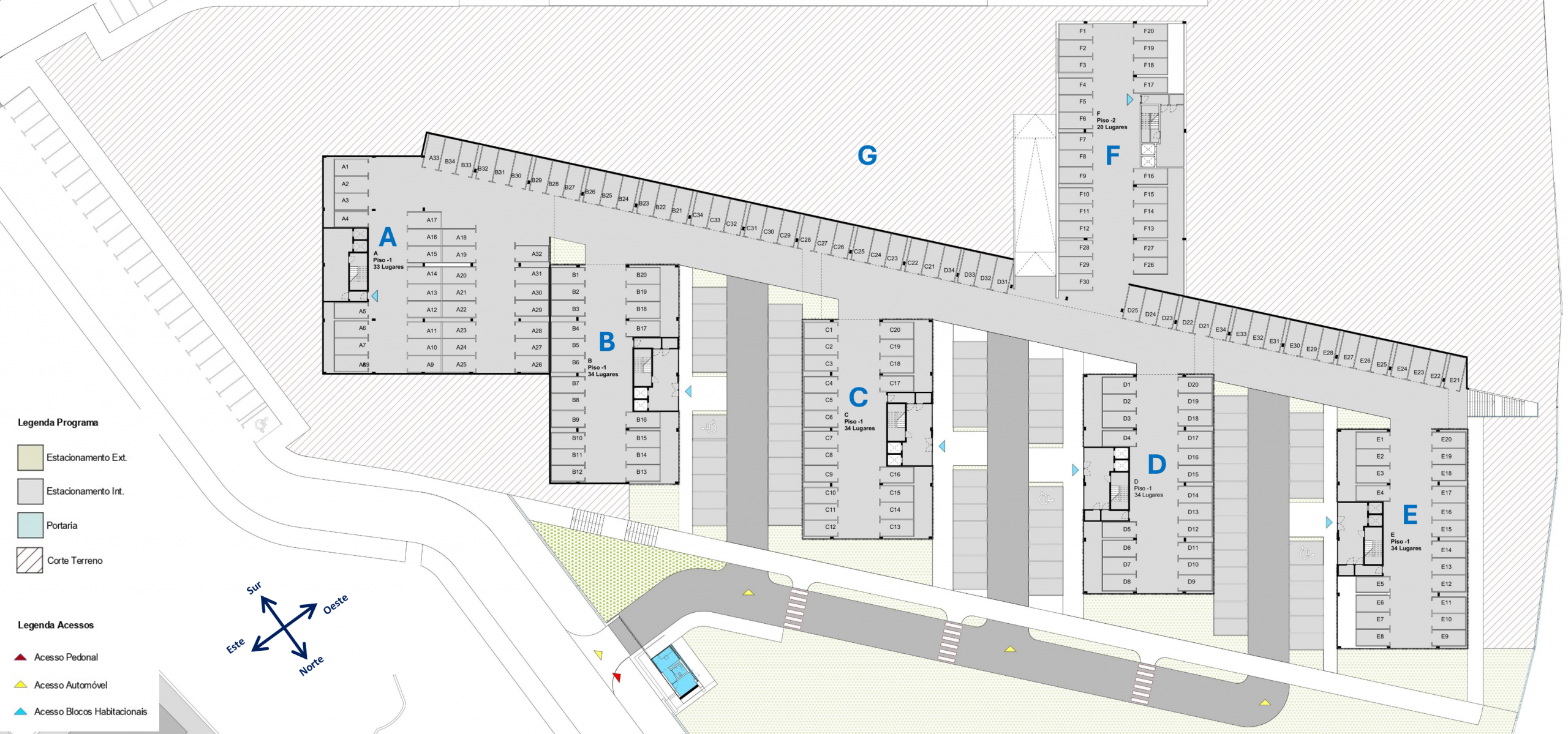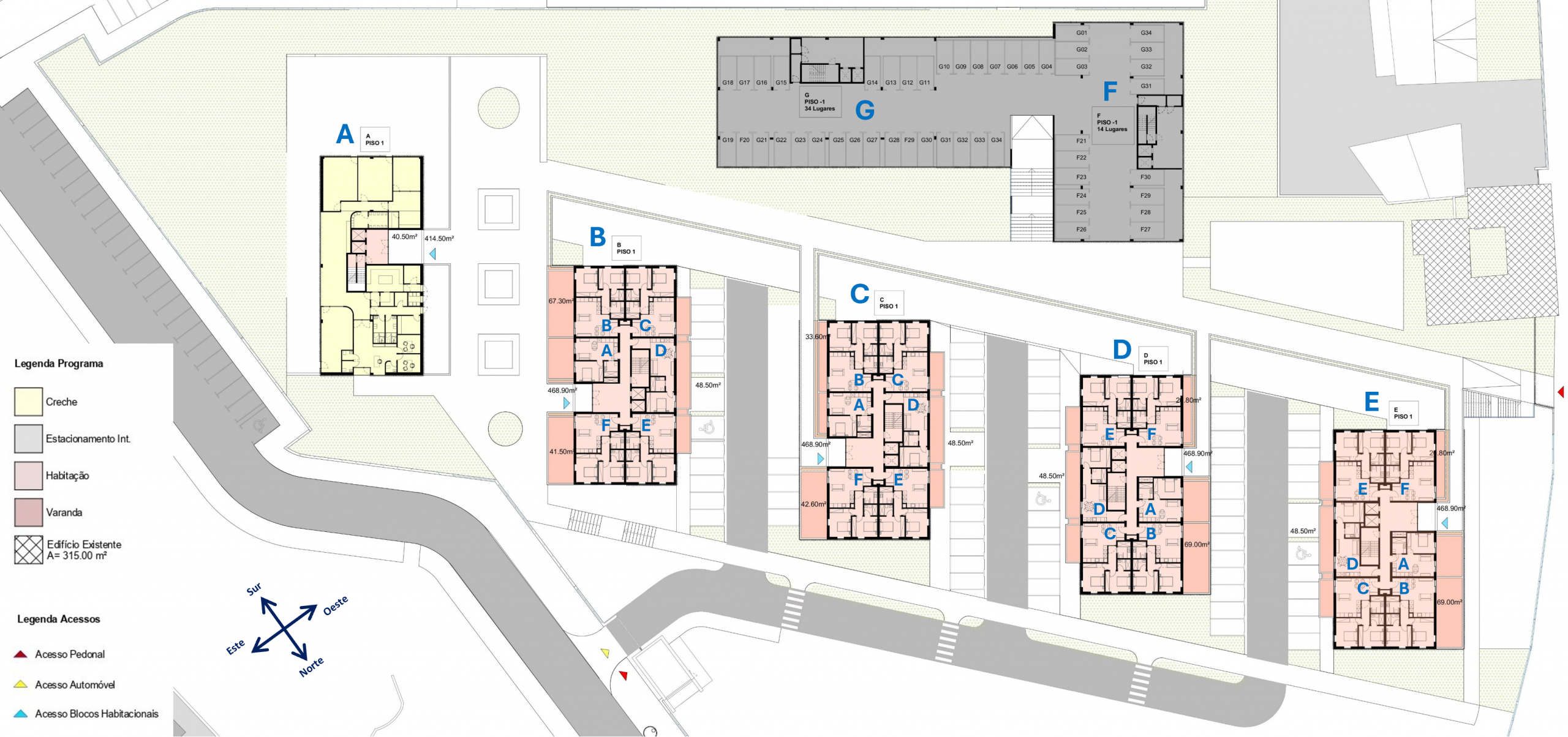 Distribución de los pisos – Bloques A a E planta 1 | Bloques F y G aparcamientos