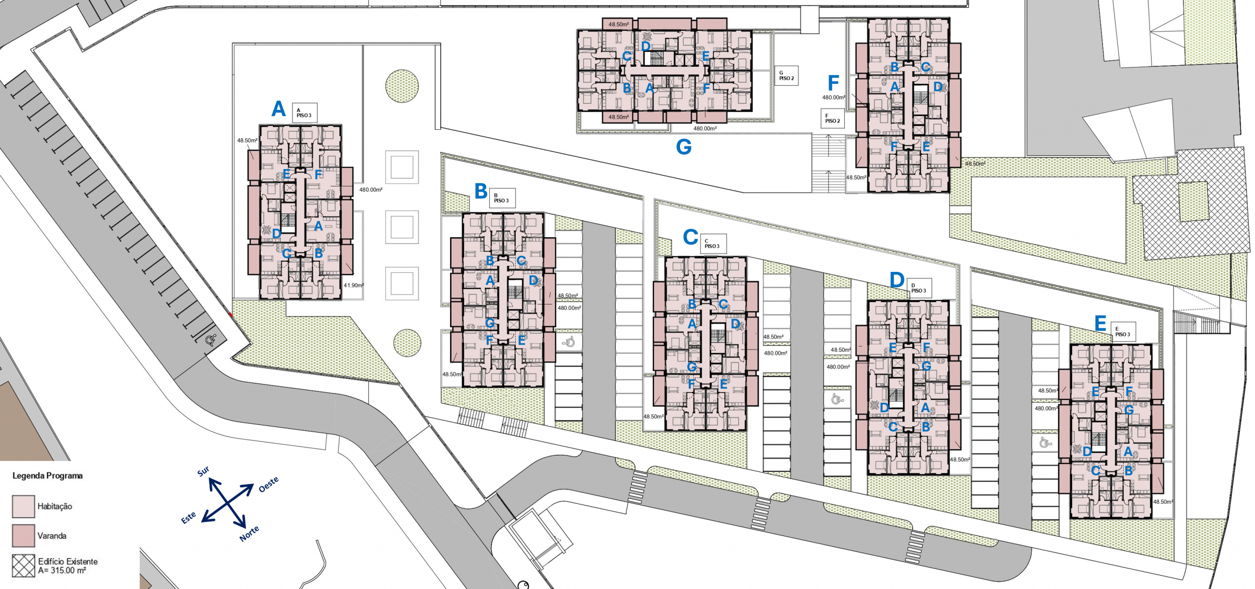 Distribución de los pisos – Bloques A a E plantas 2 a 5 | Bloques F y G planta 1