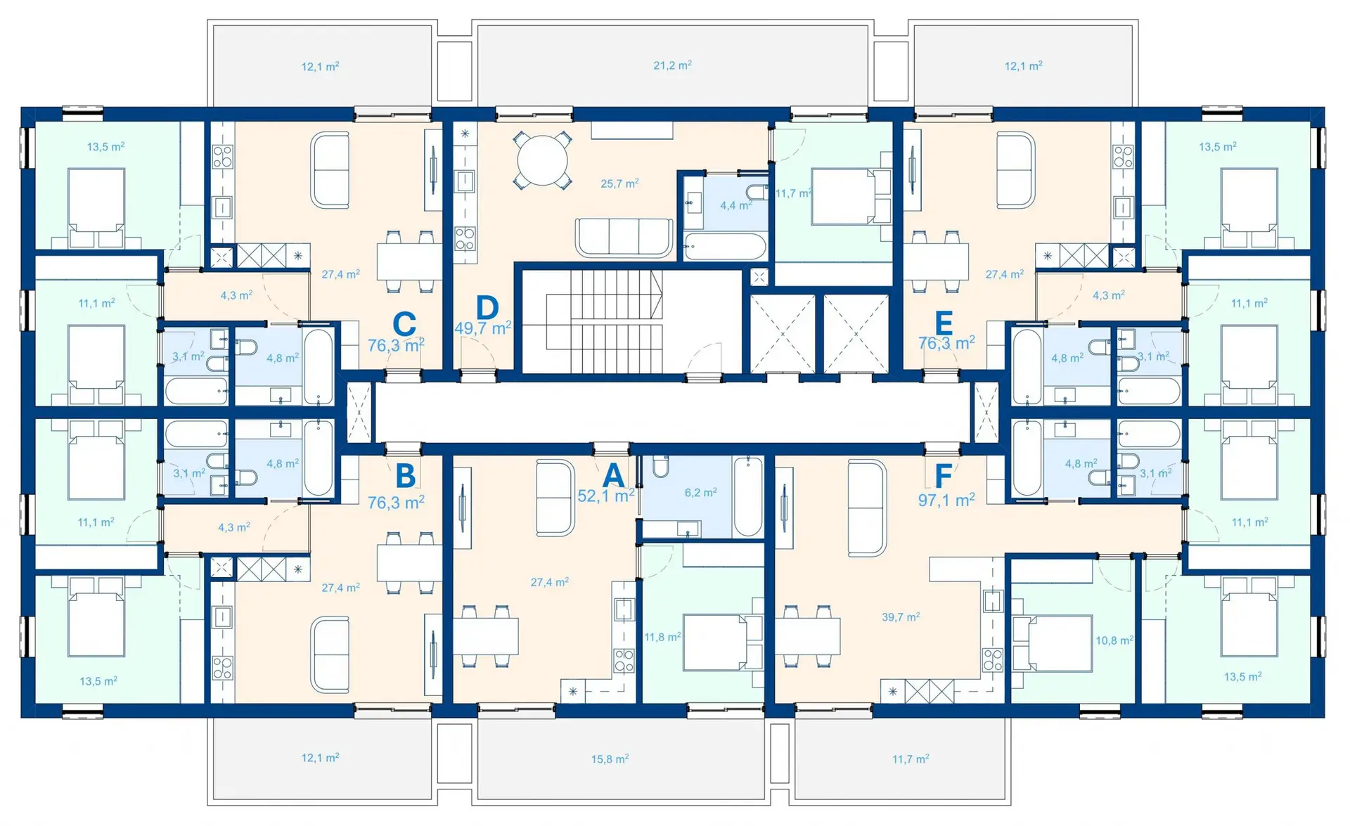 Distribuição de apartamentos – Blocos A a E pisos 2 a 5 | Blocos F e G piso 1