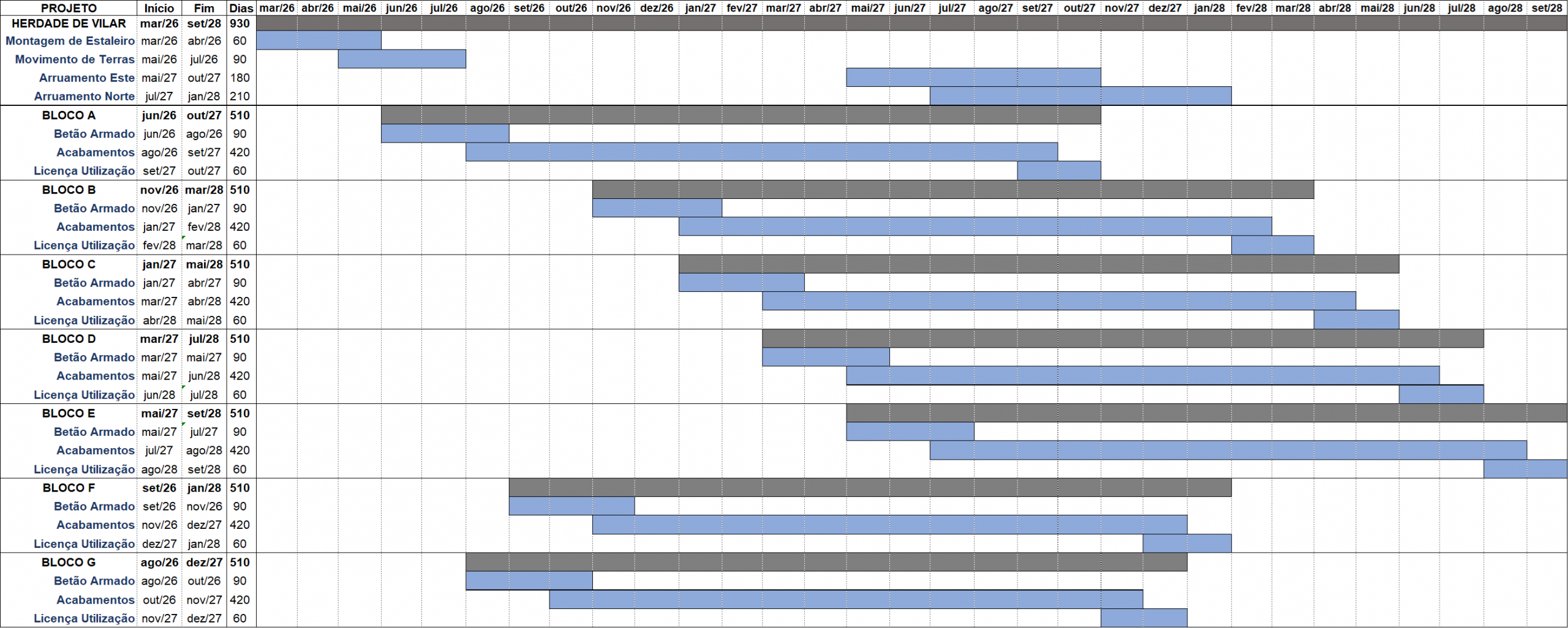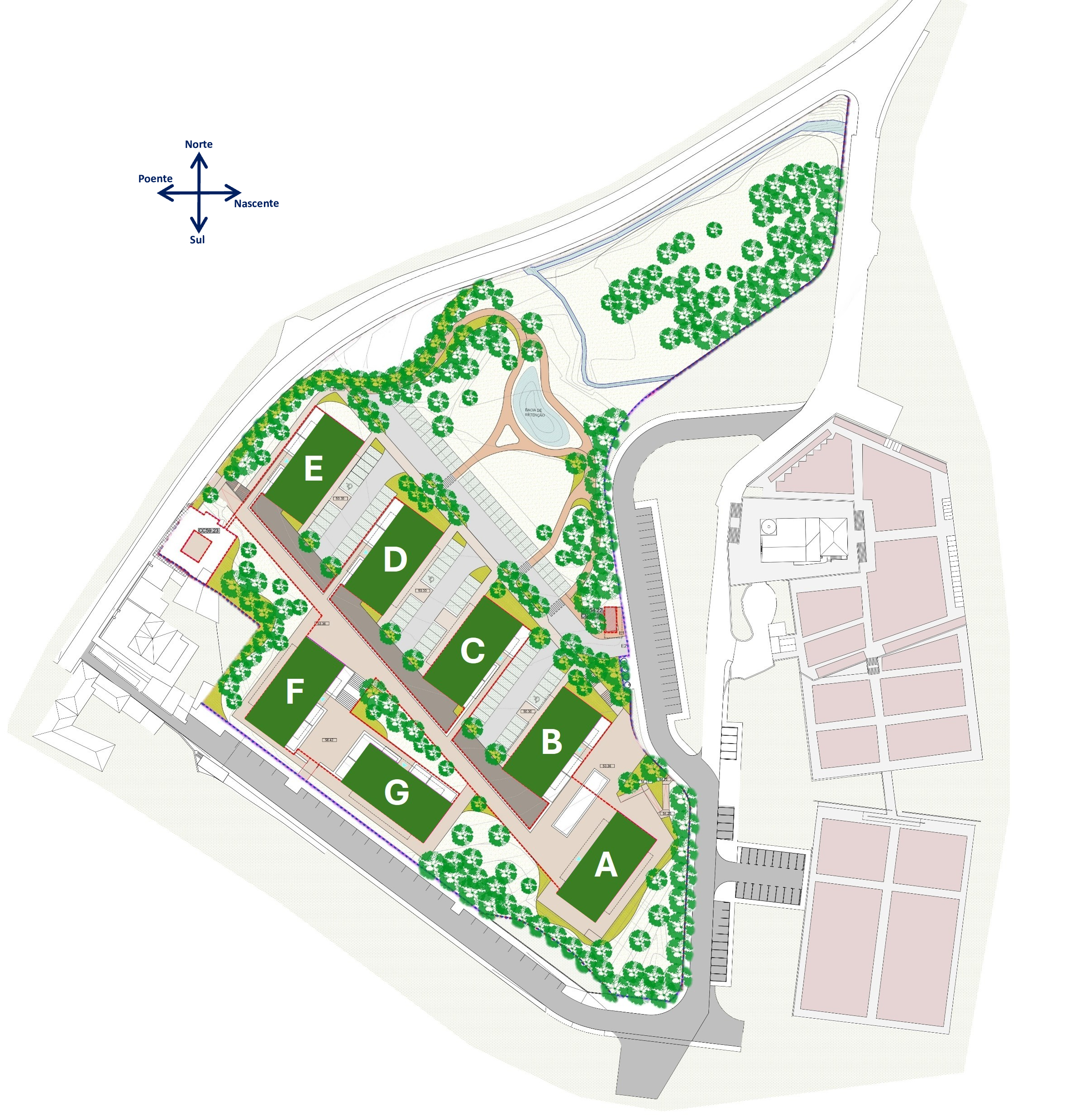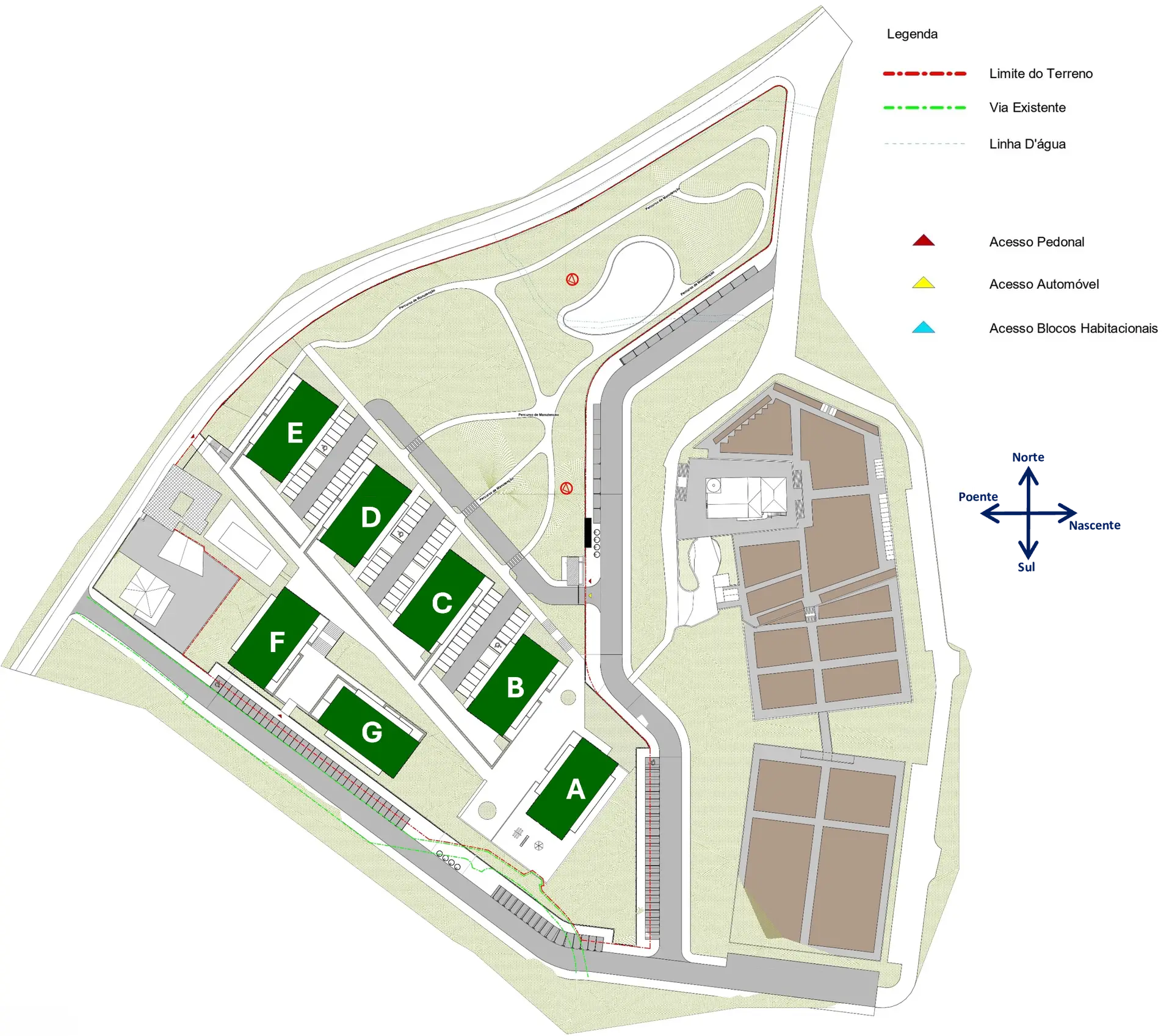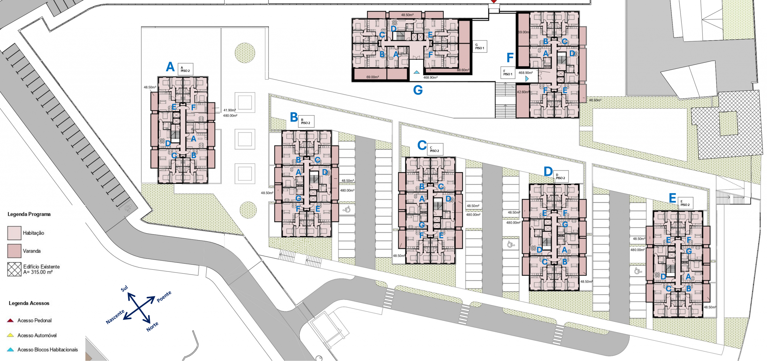 Distribuição de apartamentos – Blocos A a E piso 1 | Blocos F e G estacionamentos